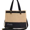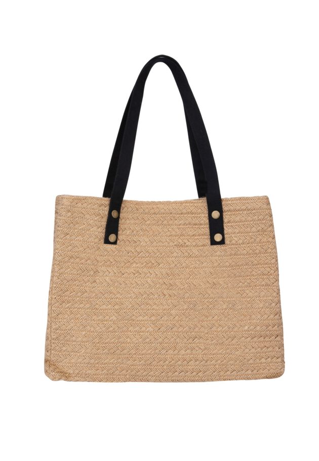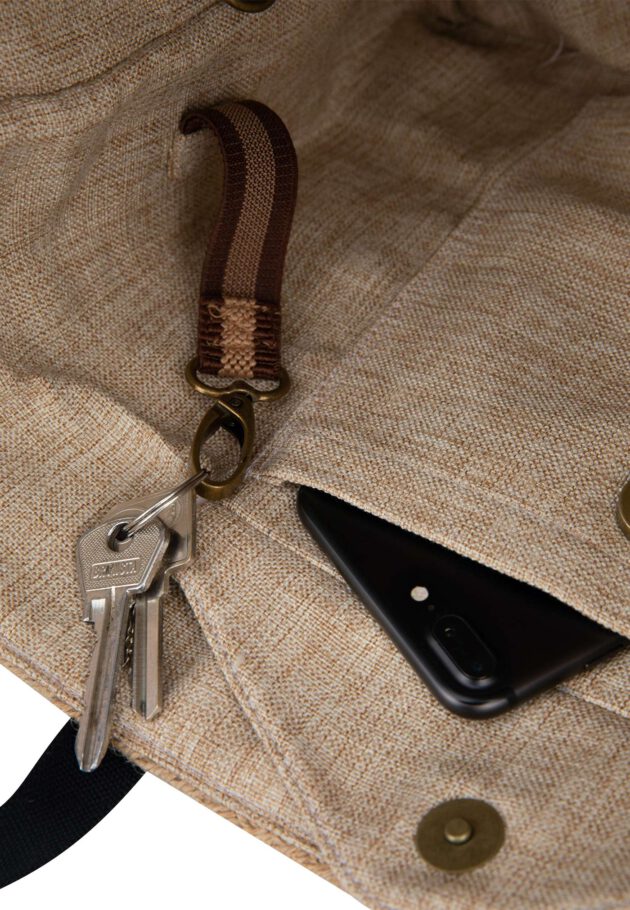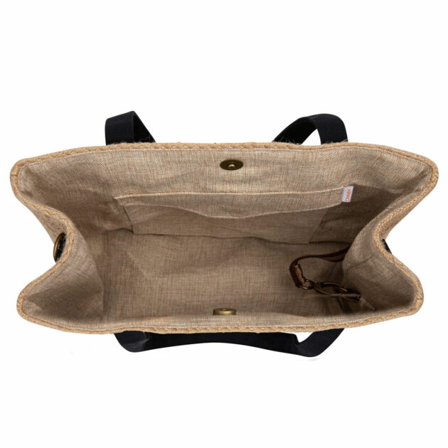 Gefertigt aus robusten, gewebten Jutefasern überzeugt sie durch Stabilität und zeitloses Design. Dank des abnehmbaren Schulterriemens kannst du sie flexibel als Hand- oder Umhängetasche tragen. Praktische Extras wie ein integriertes Schlüsselband, ein Flaschenhalter und eine Innentasche mit Druckverschluss sorgen für Ordnung und Komfort.
