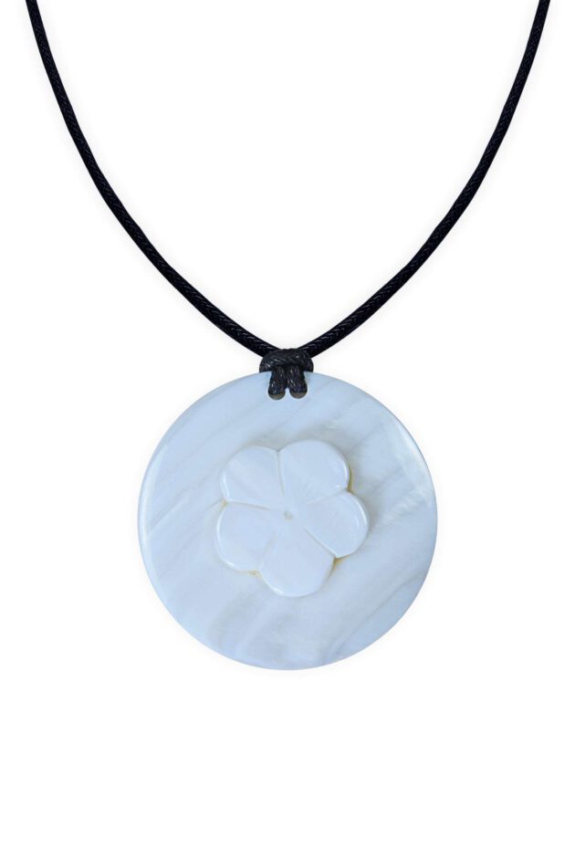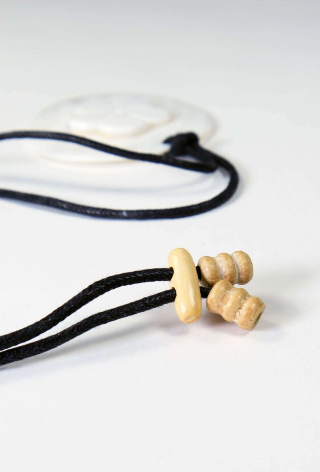Das Textilband ist mit Holzperlen verziert und lässt sich somit in der Länge individuell einstellen. Da es sich bei Perlmutt um ein natürliches Material handelt, ist jedes dieser handgefertigten Schmuckstücke ein Unikat – so einzigartig wie ihre Trägerin.