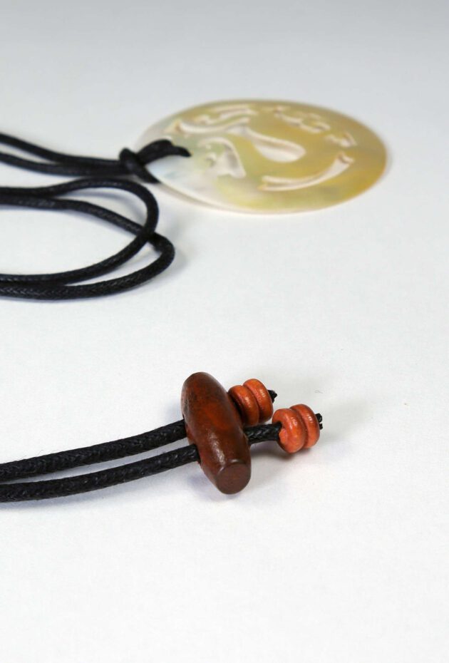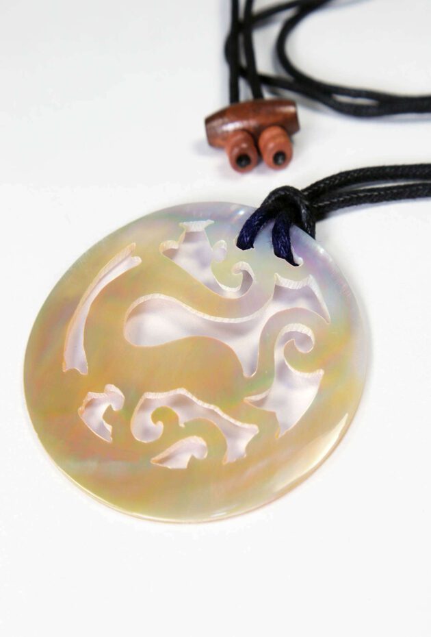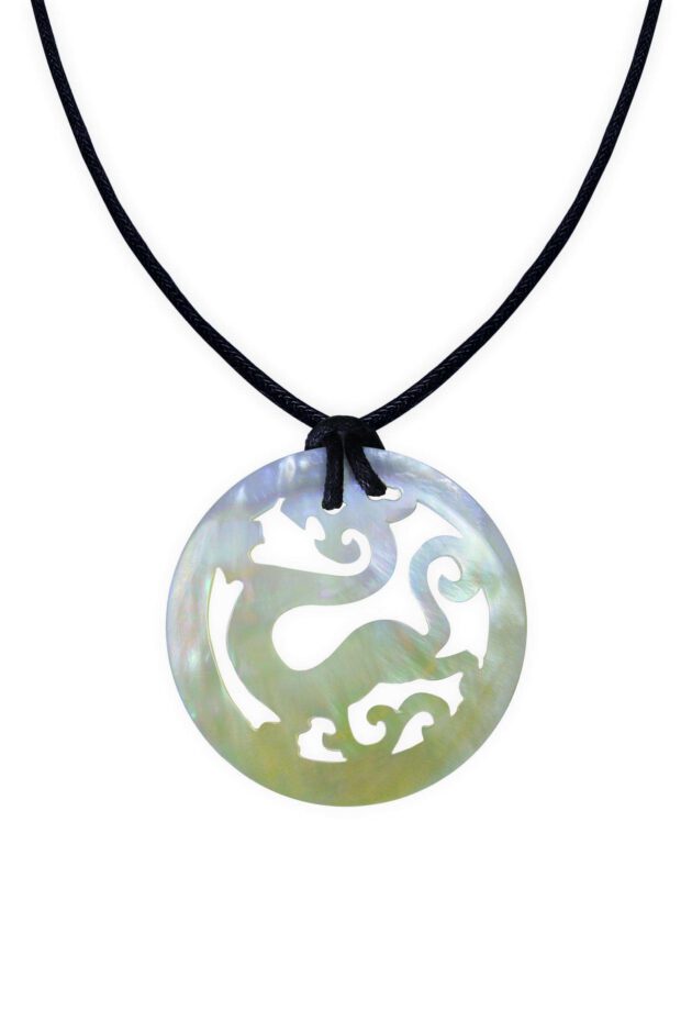 Dieser Kettenanhänger GELDSEGEN aus echtem Perlmutt wurde aufwendig in filigraner Handarbeit gefertigt. Das Perlmuttstück mit dem eingeschnitzten Drachen schimmert bei jeder Bewegung in irisierenden Cremeweiß- bis Goldtönen.