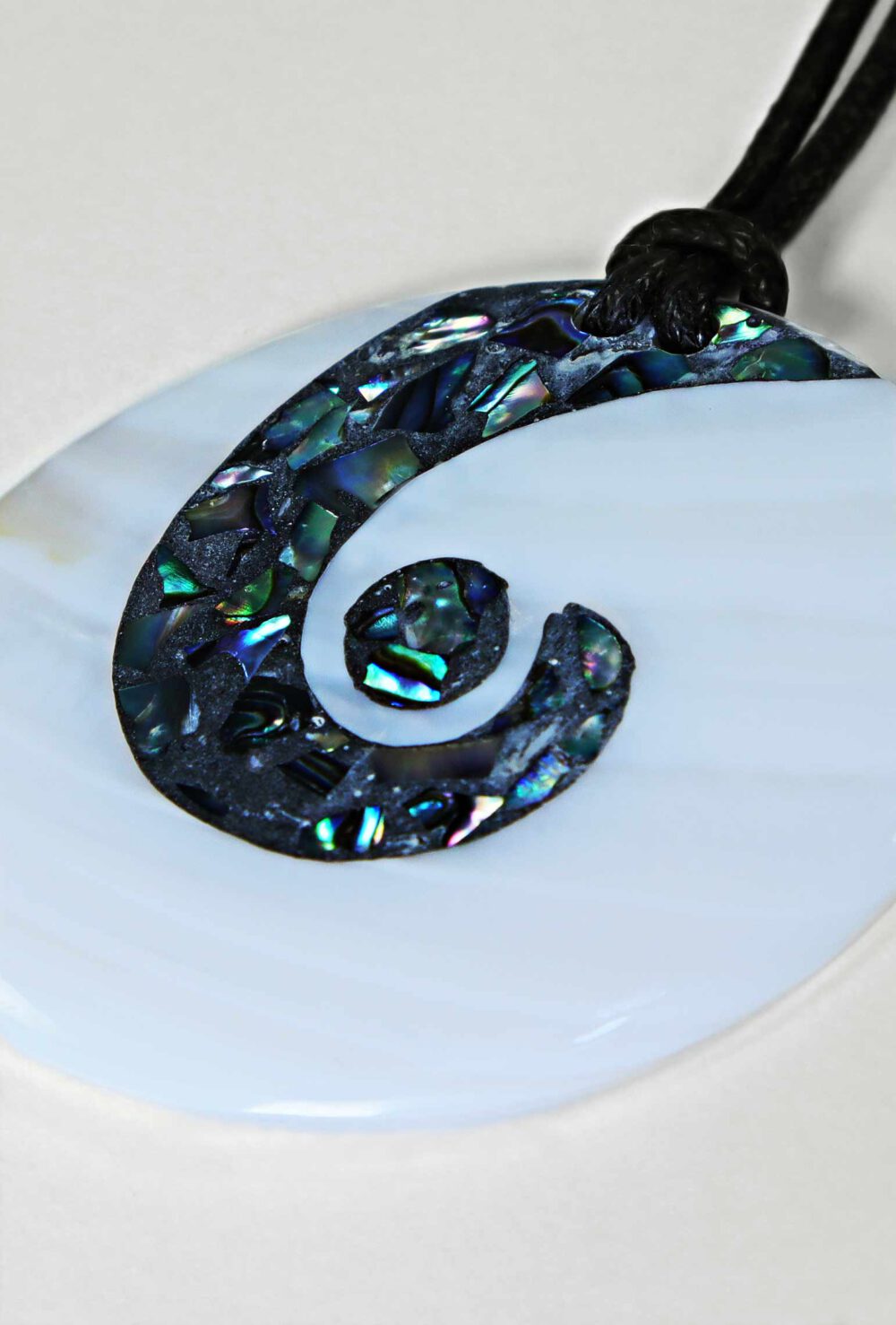 Diese Kette ist ein echter Blickfang! Sie hat einen wunderschönen Anhänger aus echtem Perlmutt, der mit einer Spirale verziert ist – das Symbol der Unendlichkeit. Bei jeder Bewegung schimmert der Anhänger in irisierenden Cremeweißtönen und opalhaften Buntschimmern. In aufwendiger Filigranarbeit wurden die kleinen, grünlich schimmernden Perlmuttelemente auf die helle Perlmuttplatte aufgesetzt. Was für ein Kontrast!