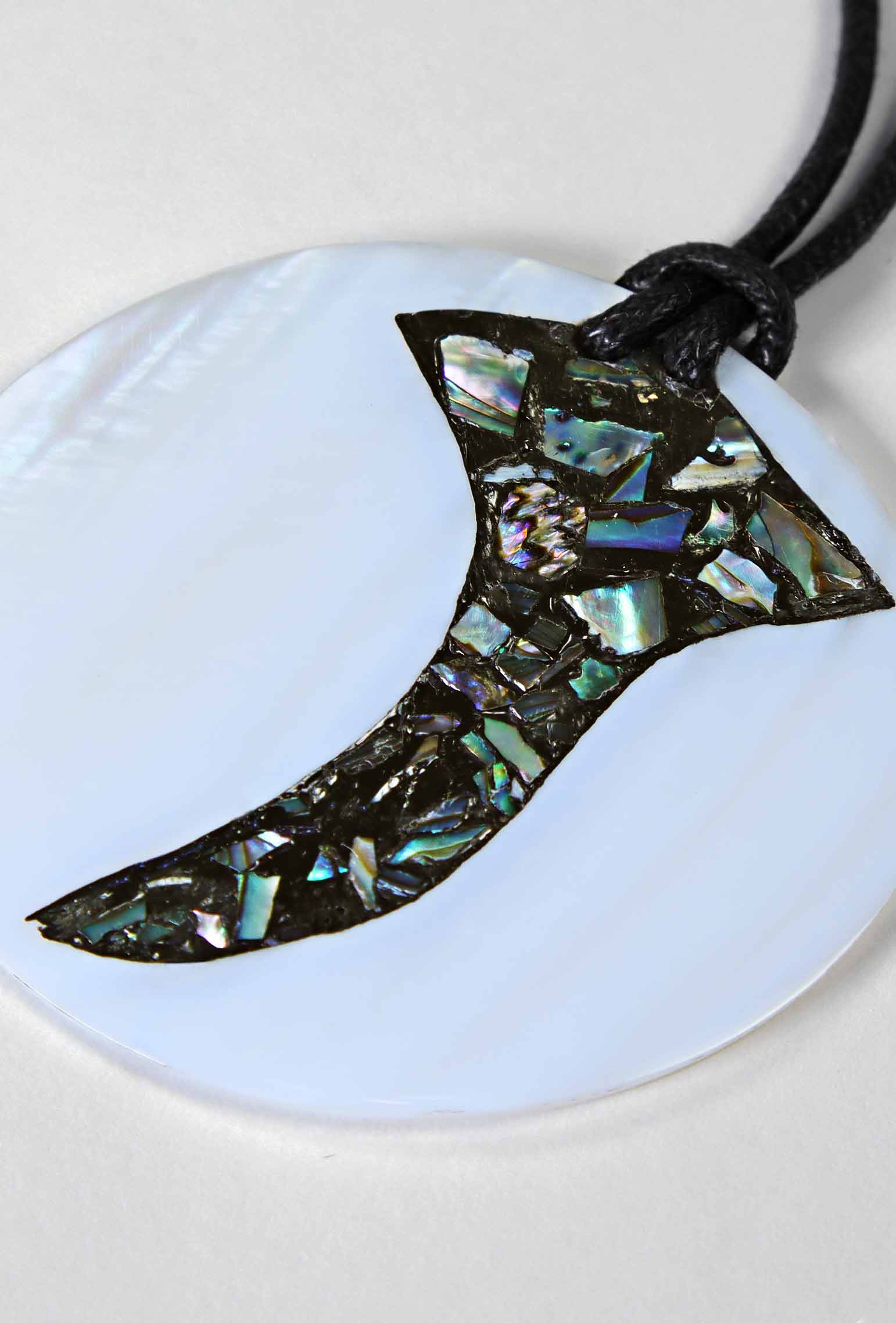 Anhänger: Durchmesser ca. 6 cm. Kette: Textil, ca. 45 cm, mit verstellbarem Holz-Verschluss.