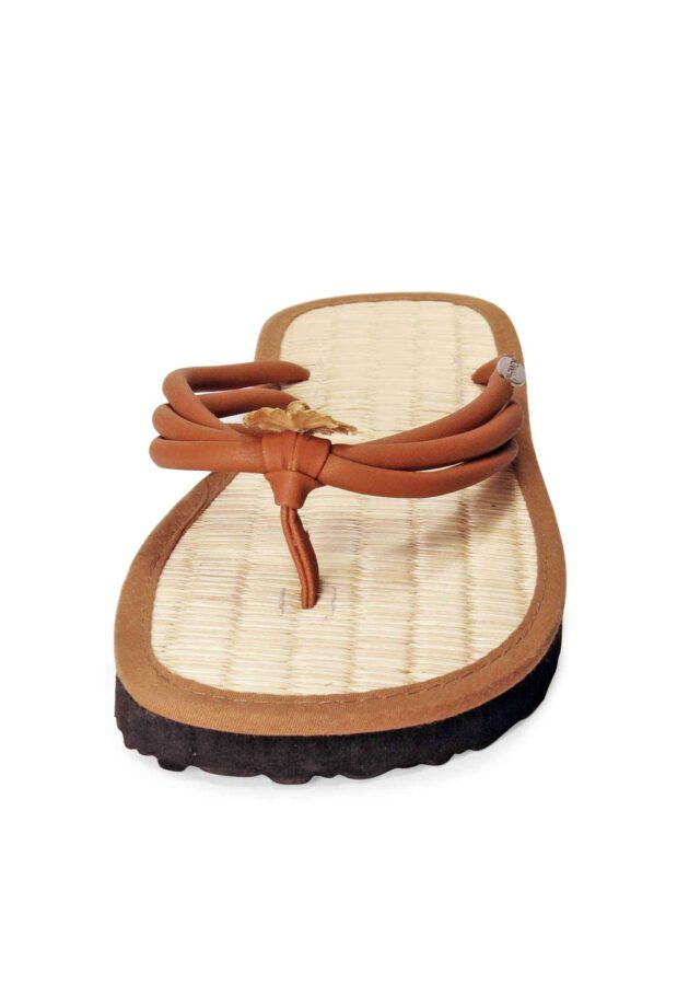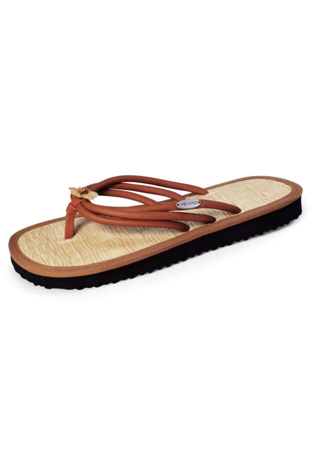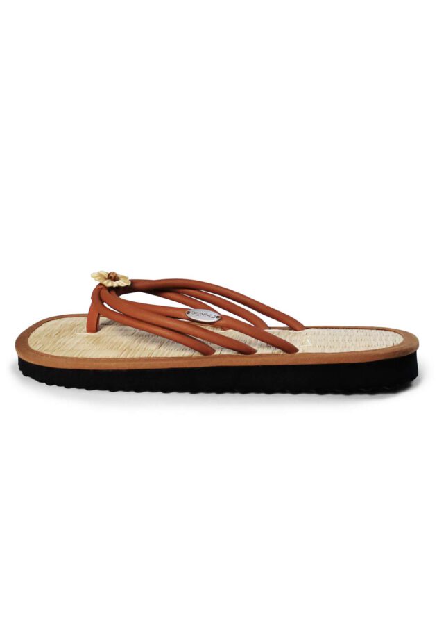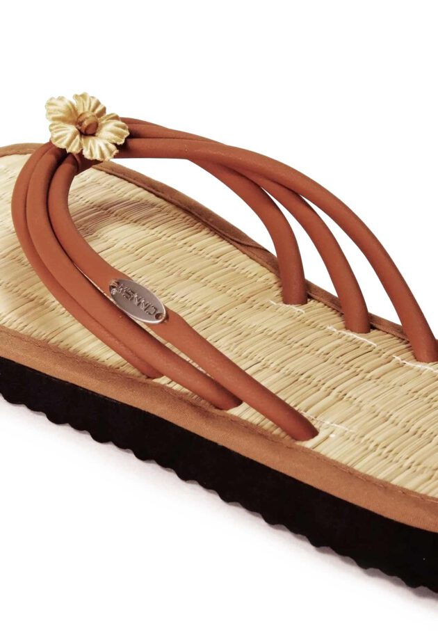 Diese feminine Sandale mit filigraner Blüte ist ein echter Hingucker – egal ob an der brasilianischen Küste oder in deiner Stadt. Die handgefertigte Sandale verfügt über drei Riemchen auf jeder Seite, je ca. 5 mm breit, aus weichem Kunstleder. Mittig ziert eine zarte Seidenblüte das Modell. Der Zehensteg aus Kunstleder sorgt für ein besonders angenehmes Tragegefühl.