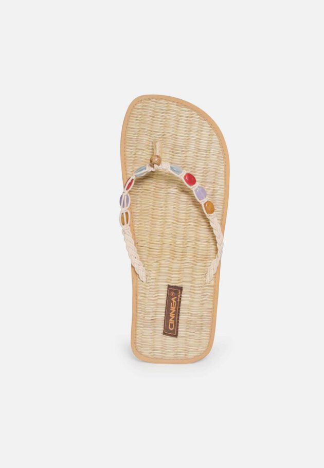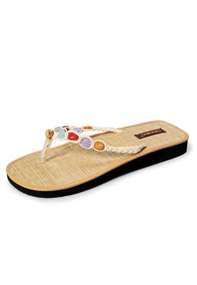 Das Fußbett ist aus Naturbinsen gearbeitet, dies fördert die Vitalität, da die Fußmeridianen angeregt werden und die Fußsohlen angenehm zart massiert werden. Gleichzeitig wird so die Hornhautbildung vermindert. Unterhalb dieses Fußbettes ist die bewährte Zimt-Kräutermischung eingearbeitet. Dies wirkt sich bei jedem Schritt positiv auf das Wohlbefinden aus und sorgt für wohltemperierte Füße. An heißen Sommertagen ebenso, wie an kühlen, lauen Abenden.